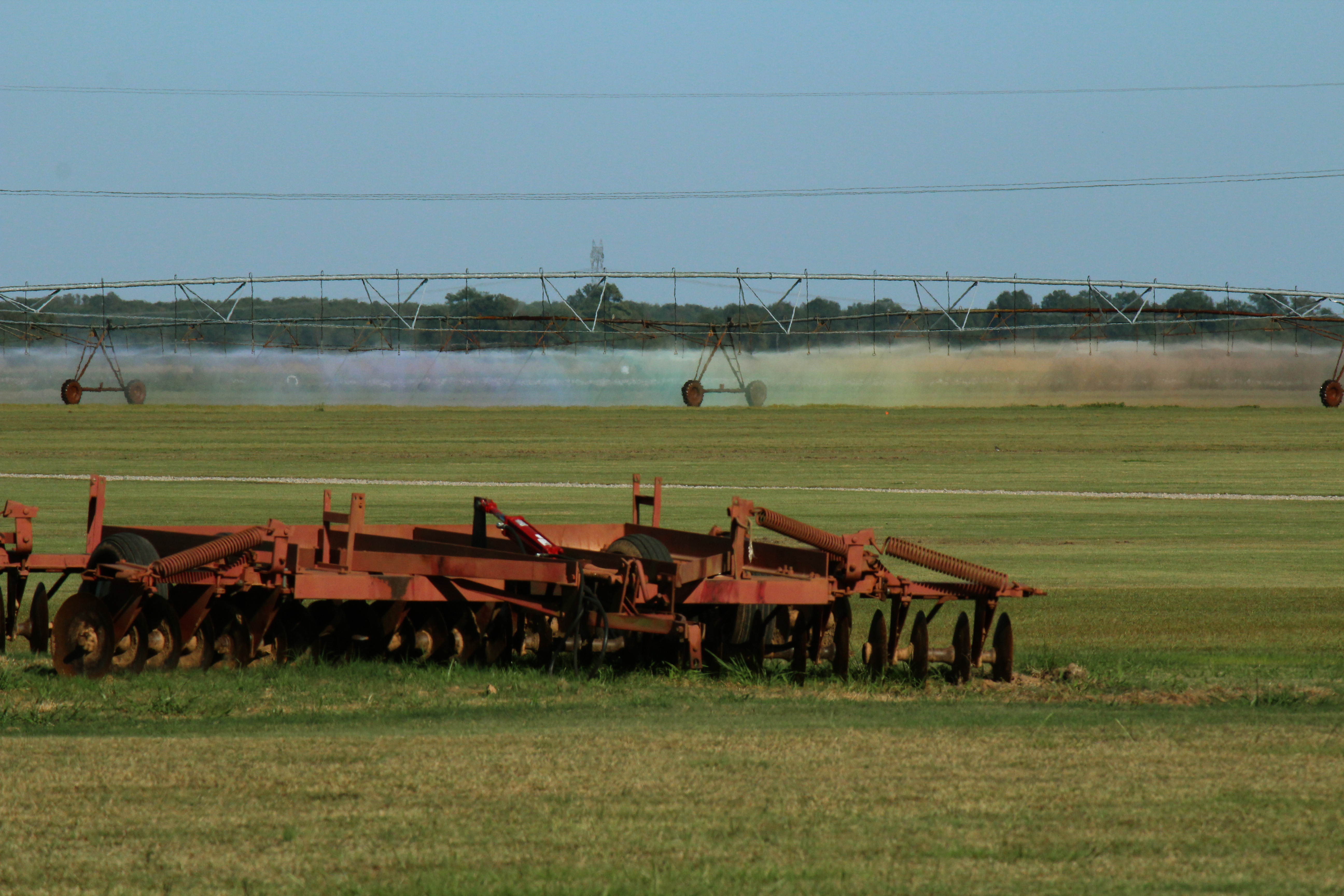 A rainbow appears as an area farmer waters his fields outside of Keo.