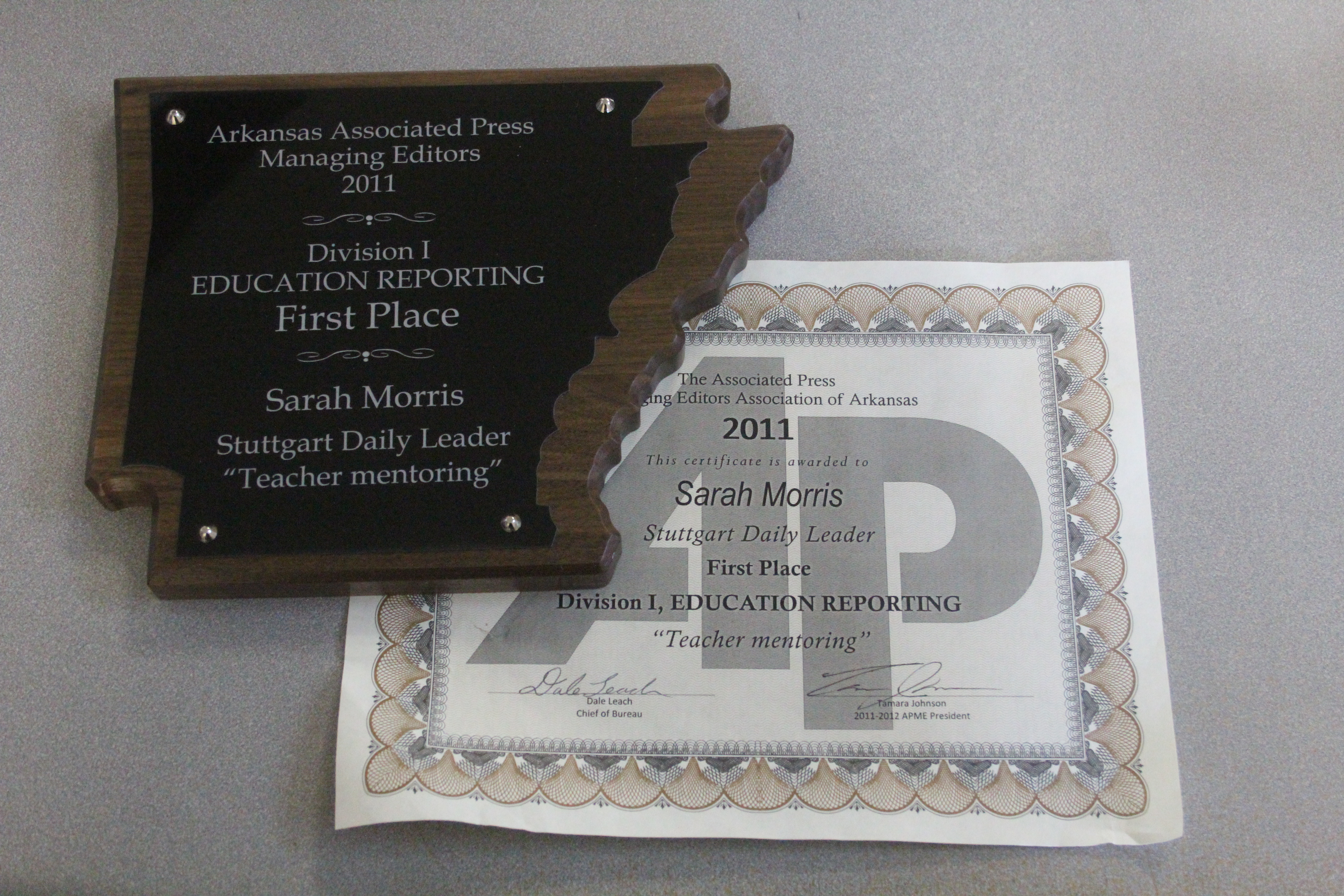 My week is considerably brighter now that I have received my plaque from the Arkansas Associated Press Managing Editors for first place in education reporting. I won the award for my story “Teacher Mentoring.”