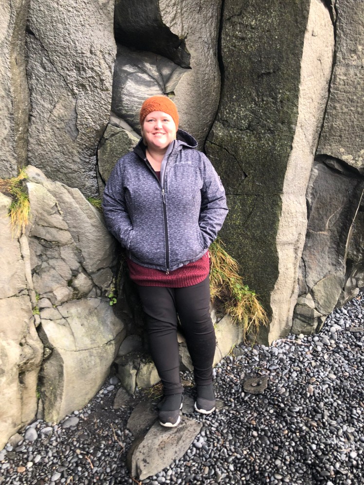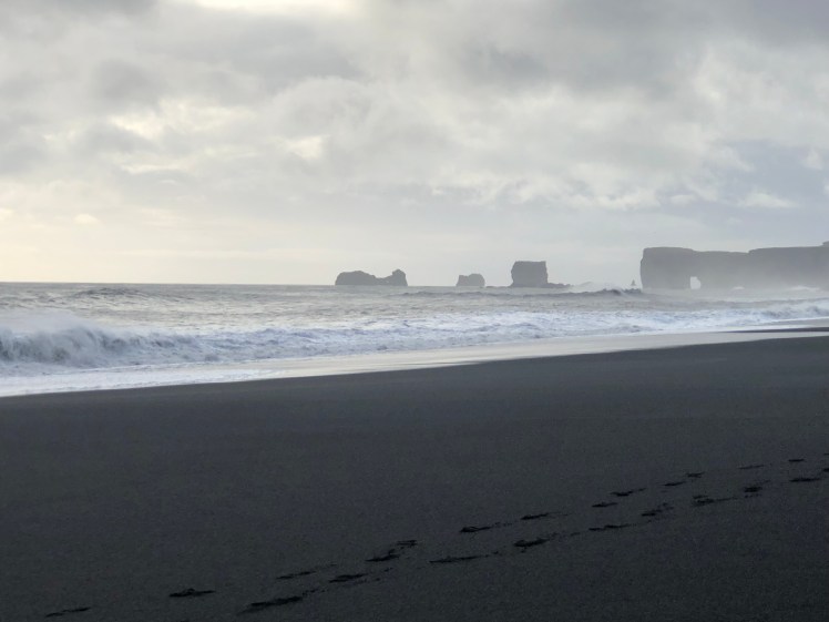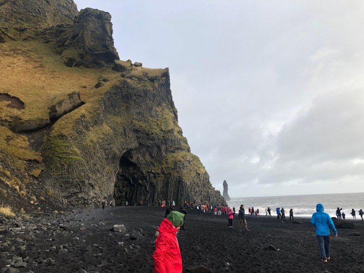 Afterwards, we stopped by Icewear/Vik Wool to look around and to step onto the nearby black sand beach. We shopped a little before hopping back into our van to go to the nearby Reynisfjara Beach, which has black sand, a small cave and the Reynisdrangar basalt columns. The winds were as strong as the waves crashing to shore. Our driver warned us before we got there of two things: Don’t turn your back to the sea because the waves are too strong and don’t go into the water even to dip our toes in.
