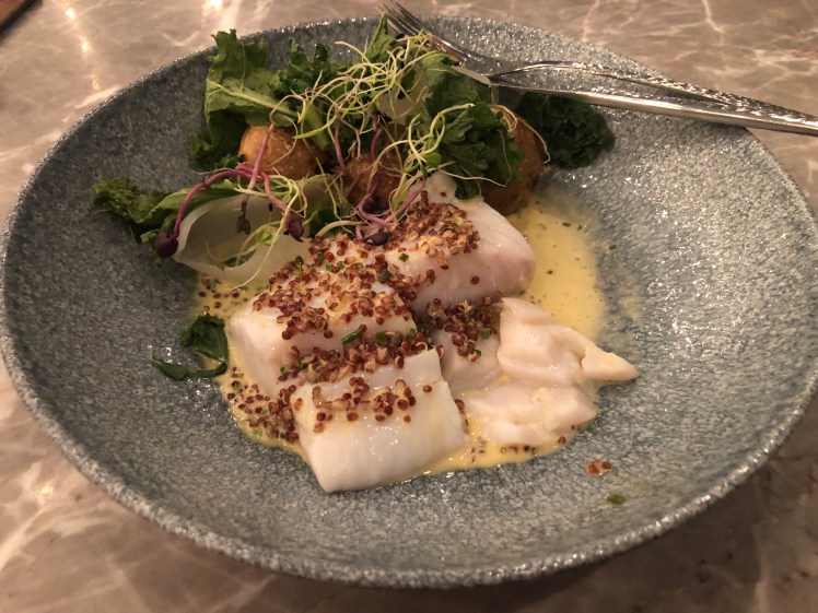 Tonight was our final chance to see the Northern Lights; however, our tour was cancelled once again due to cloudy weather. Getting back to Reykjavik at 7 p.m., we decided to instead go to Perlan, a modern interactive museum that had a Northern Lights planetarium show called Áróra. I did enjoy learning how the Northern Lights are created, and the roles it played in various cultures. We originally planned on going to the 8 p.m. show; however, we were 4 minutes late getting there so we had to wait until the 9 p.m. show. We spent our hour-long wait eating at the Ut I Blainn, which overlooks Reykjavik. I had the steamed cod with kale, onion, preserved lemons and beurre blanc. It was good, but I left still hungry – the same as one of my aunts who also had the steamed cod.
