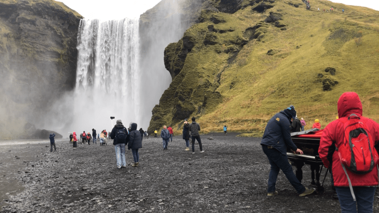 Next, we traveled to the 197-foot Skógafoss waterfall, which is 82-feet wide. According to the nearby Skógar Folk Museum, legend claims that when the sun shines, a store of gold hidden by original settler Prasi may be glimpsed glittering behind the water. The waterfall is south of the Eyjafjallajökull glacier volcano, and flows through the Skógárgil gorge which has more than 20 additional waterfalls. Someone brought a traveling piano to the waterfall so we had music to go with the view.