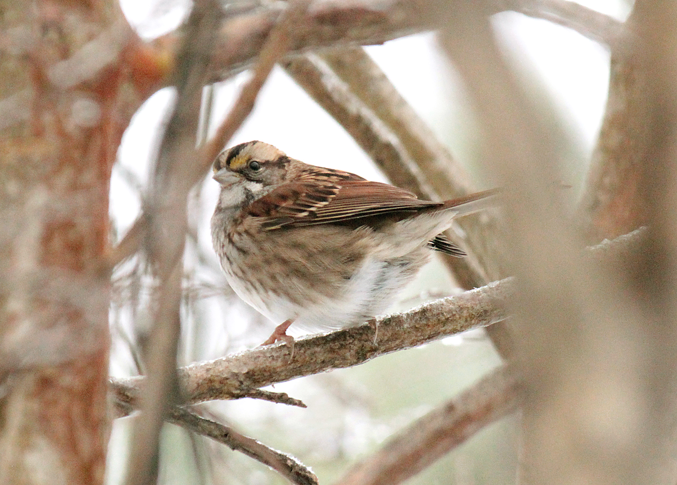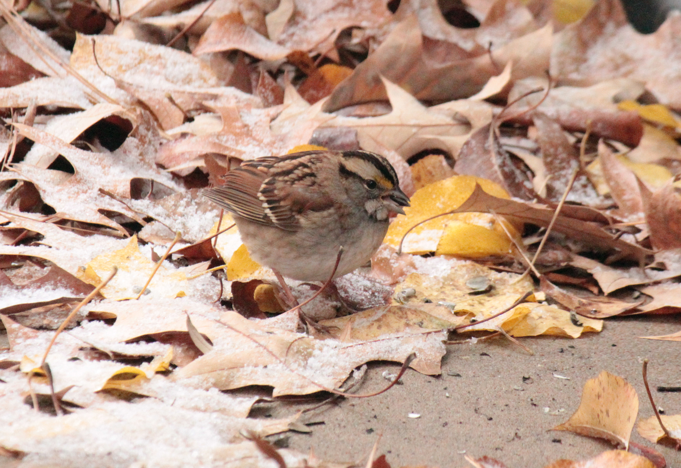 American RobinOur first winter storm blew into Arkansas early Thursday afternoon keeping me at home this past weekend. I’m not complaining — I enjoyed it. Outside ice-covered everything and we had few visitors except for cardinals, a finch, an American Robin and dozens of White-Throated Sparrows.