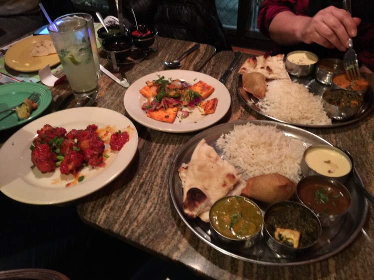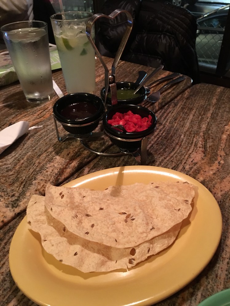 We had Nimboo Soda, a tradional Indian lemonade with mint and roasted cumin, and I ordered a sampler plate that allowed me to try a variety of dishes including vegetable samosa – a crispy turnover, seasoned potato and pea filling, a mango and mint chicken curry bowl, dal makhni – black lentils, red beans, ginger and tomato, and rice pudding for dessert.